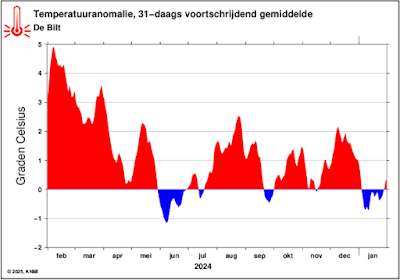 We beleven een periode met kouder weer dan gebruikelijk. Dat gemiddelde over 30 dagen is terug te zien in deze temperatuuranomalieën, waarbij de koudeperiode aardig fluctueert.
